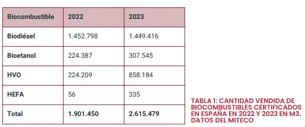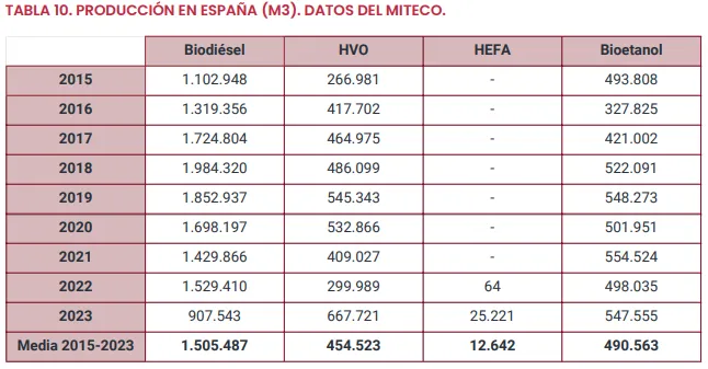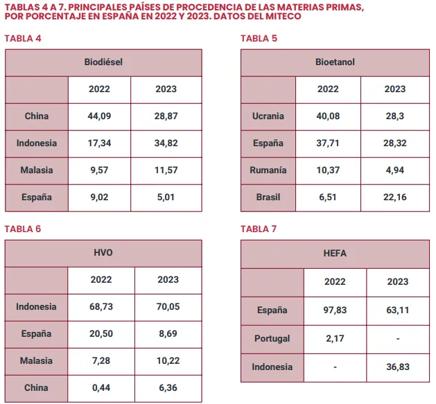 El resto procedía de aceite de cocina usado y otros tipos de residuos.Las materias primas, en su mayoría, son de fuera de España en un 75% para el biodiésel y un 86,36% las del HVO provenientes de China, Indonesia y Malasia. El 55,4% de las materias primas del bioetanol vienen de Ucrania, Brasil y Rumanía. Además, el porcentaje de bioetanol y HVO producido en España descendió de 2022 a 2023, mientras el porcentaje de HVO chino incrementó de 8 a 13%.